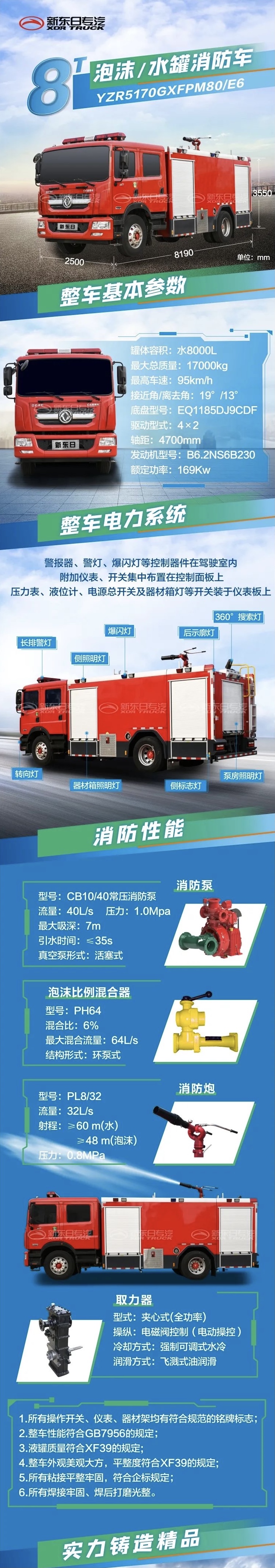 主要裝備消防水泵、水罐、泡沫混合系統、泡沫槍、炮及其他消防器材,可以獨立撲救火災。特別適用于撲救石油等油類火災,也可以向火場供水和泡沫混合液,是石油化工企業、輸油碼頭、機場以及城市專業消防必備的裝備。